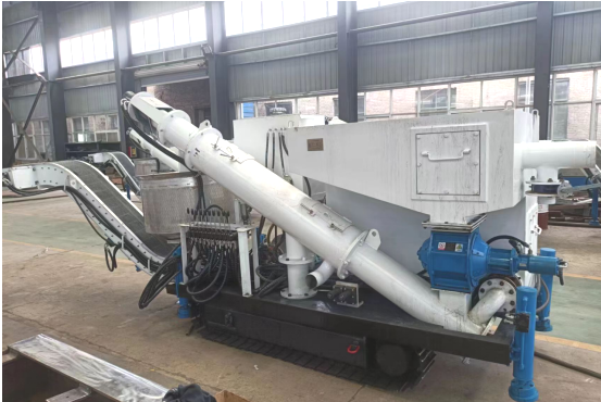 分離機具有結(jié)構(gòu)合理緊湊,操作簡單,板鏈輸送機可180°扇面自由定位旋轉(zhuǎn)、鏈速0-500mm/s可調(diào),螺旋脫水輸送機0-100r/min可調(diào)、脫水效果好,具有液壓履帶行走功能,因此該裝備移動方便。